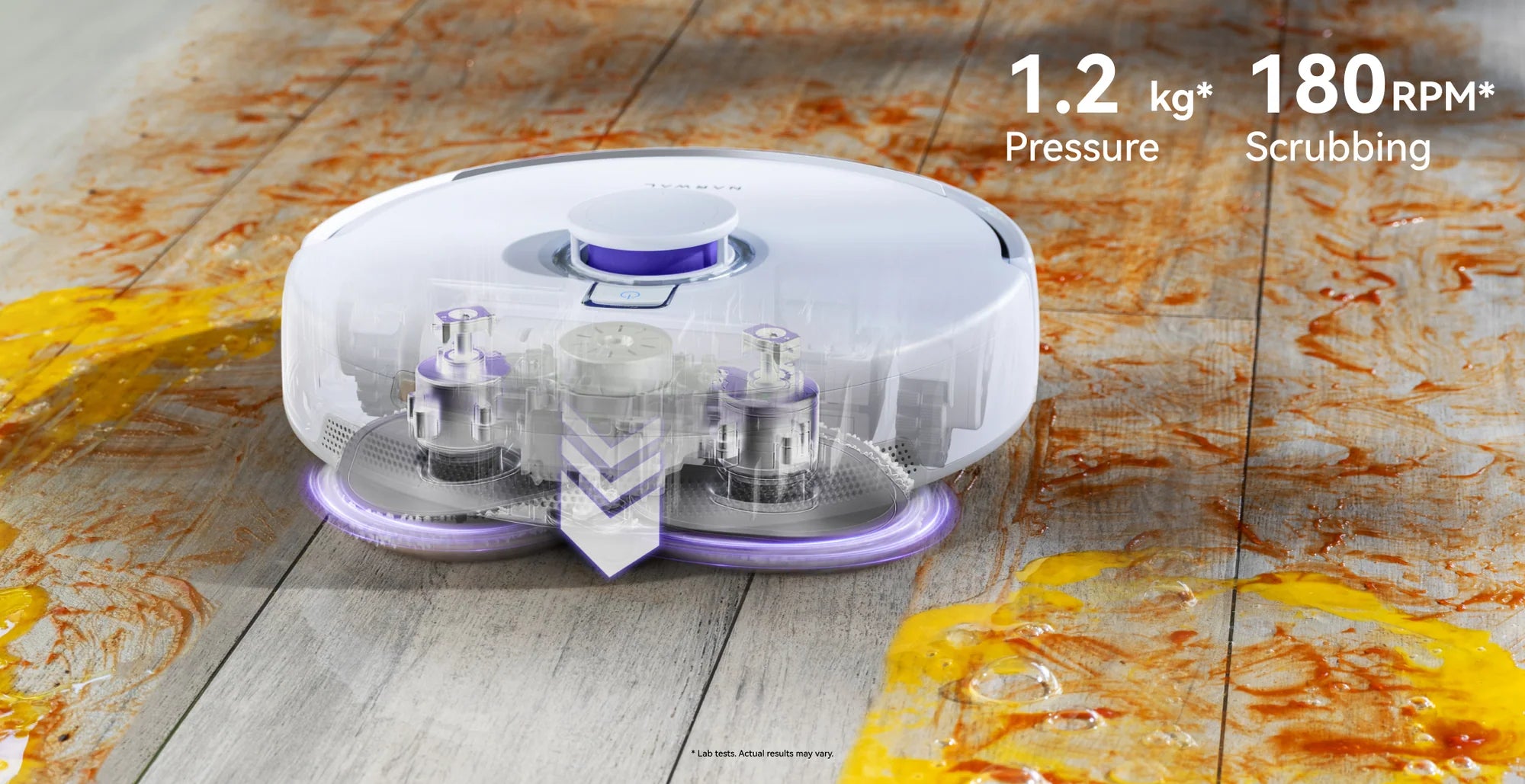 Dual mops mimic hand-cleaning and downward pressure to remove even the most stubborn stains, including 72-hour-old ketchup, coffee, and jam.*