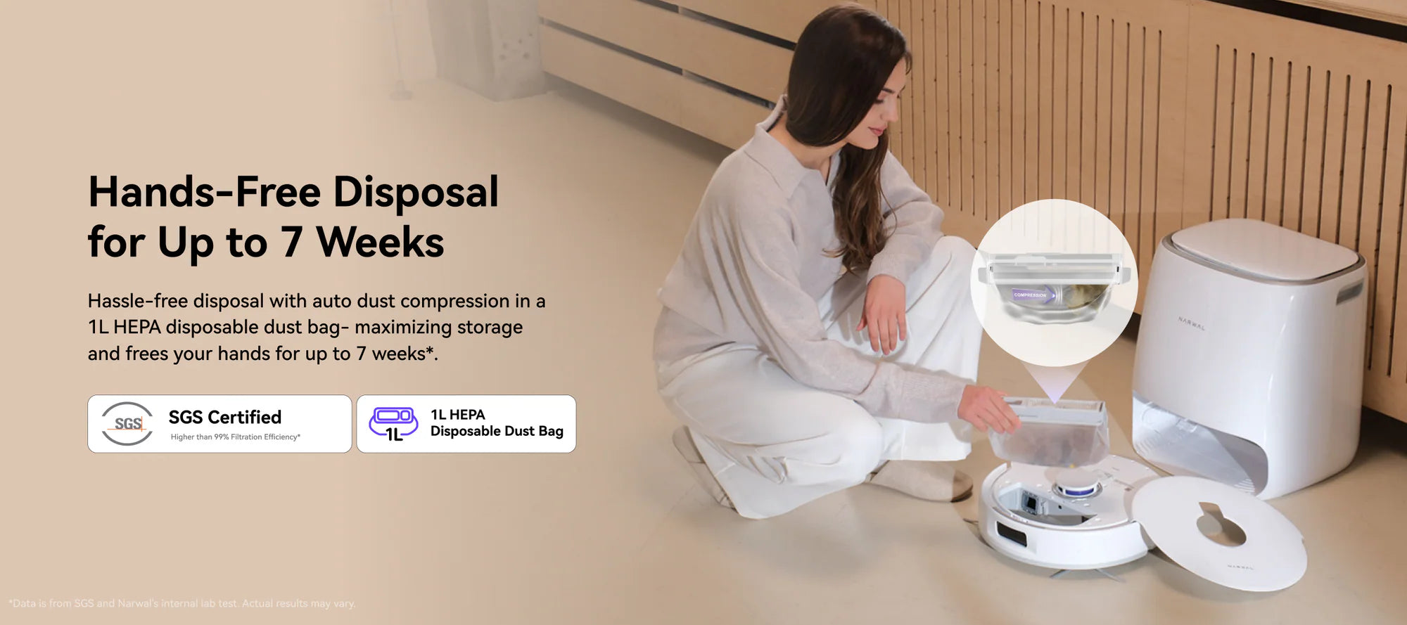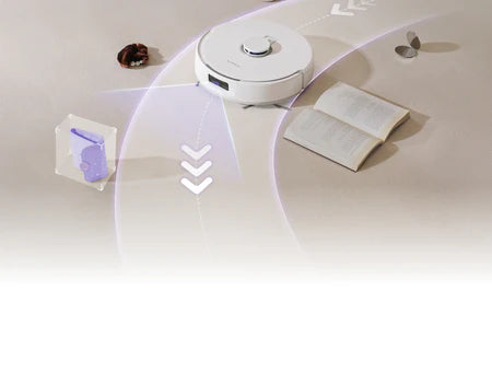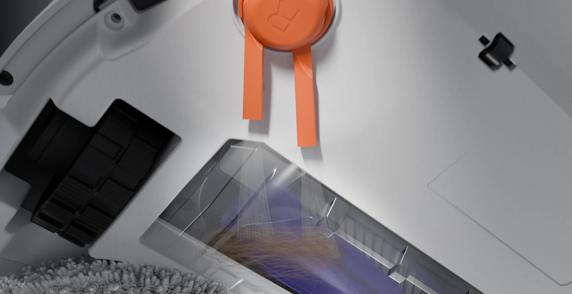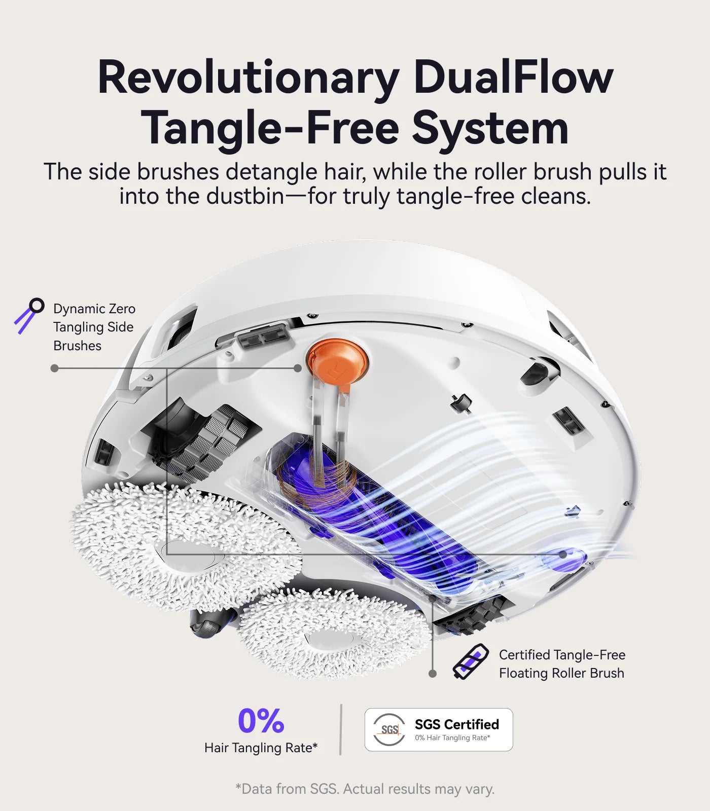 The DualFlow Tangle-Free system tackles long hair by trapping it before tangling. The Auto Detangling Side Brushes detangle hair, while the Zero-Tangling Floating Roller Brush guides it into the dustbin, leaving zero tangles.